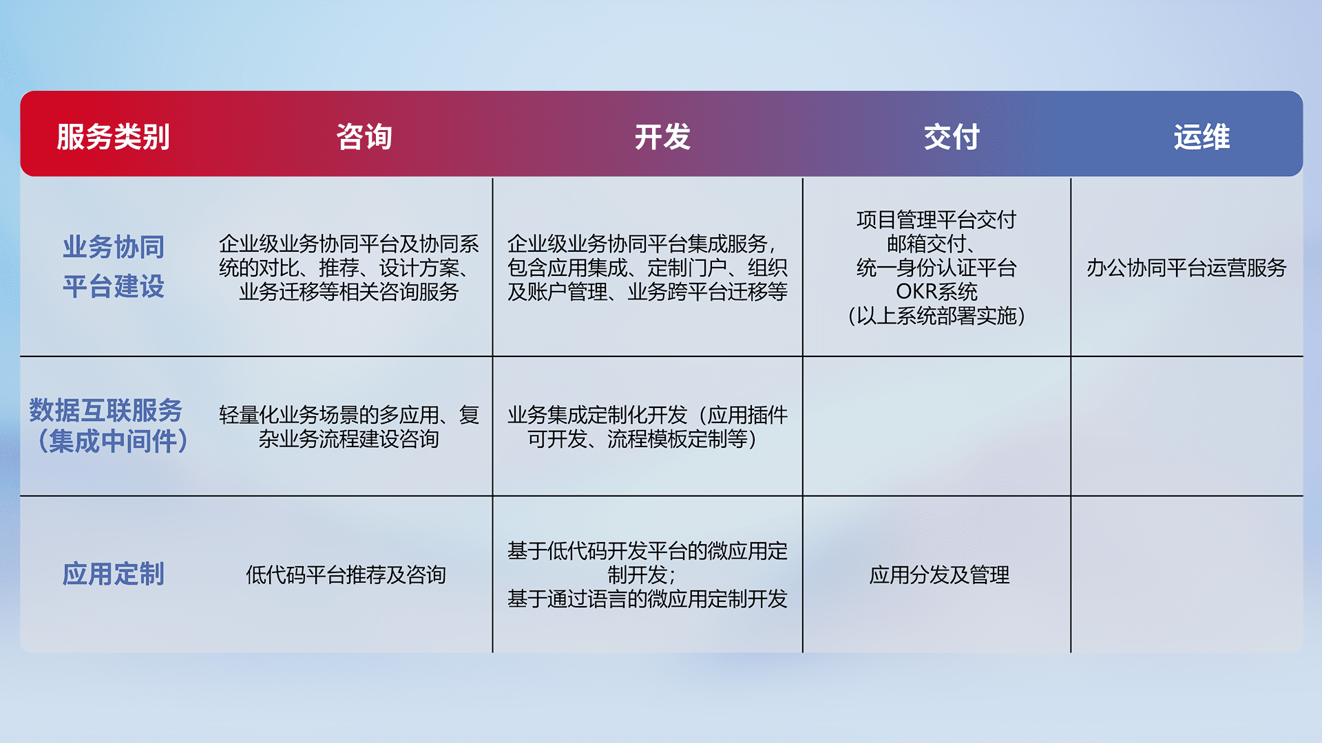 针对钉钉、、、、企微、、、、IDaas等平台级产品提供产品的规划、、、、方案、、、、交付、、定制化开发等服务,,实现如统一协同办公、、智能客户服务、、、混合会议管理、、、智能数据查询、、、等业务场景,,实现数字化转型。。。。